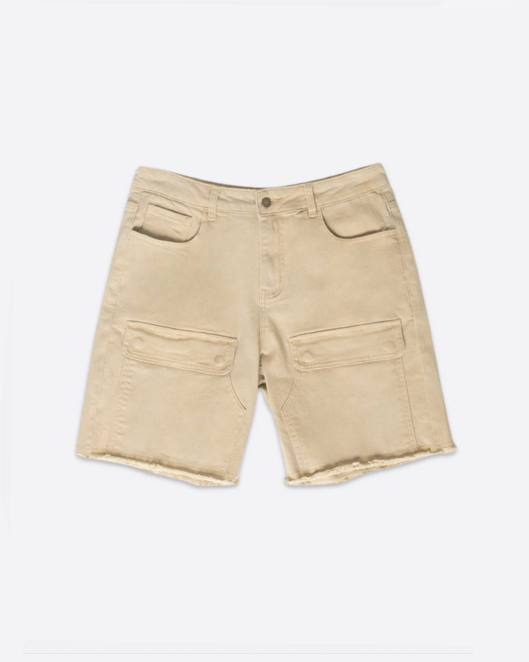 Relaxed-fit shorts featuring a stone wash and front flap pockets. Finished off with a raw cut hem.