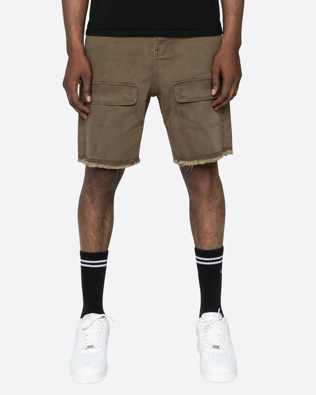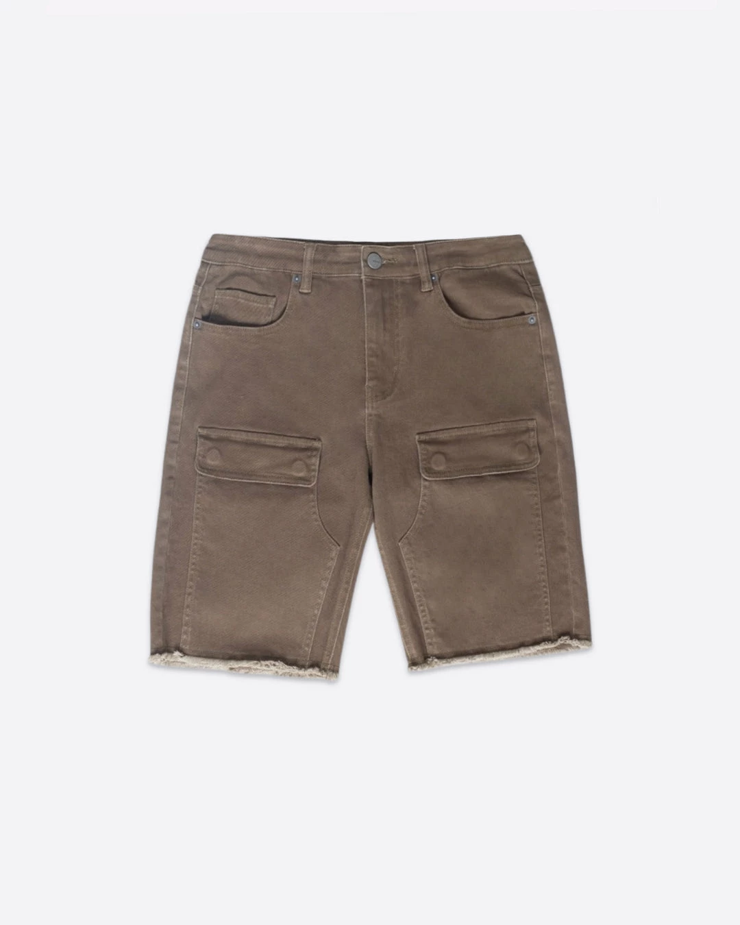 Relaxed-fit shorts featuring a stone wash and front flap pockets. Finished off with a raw cut hem.