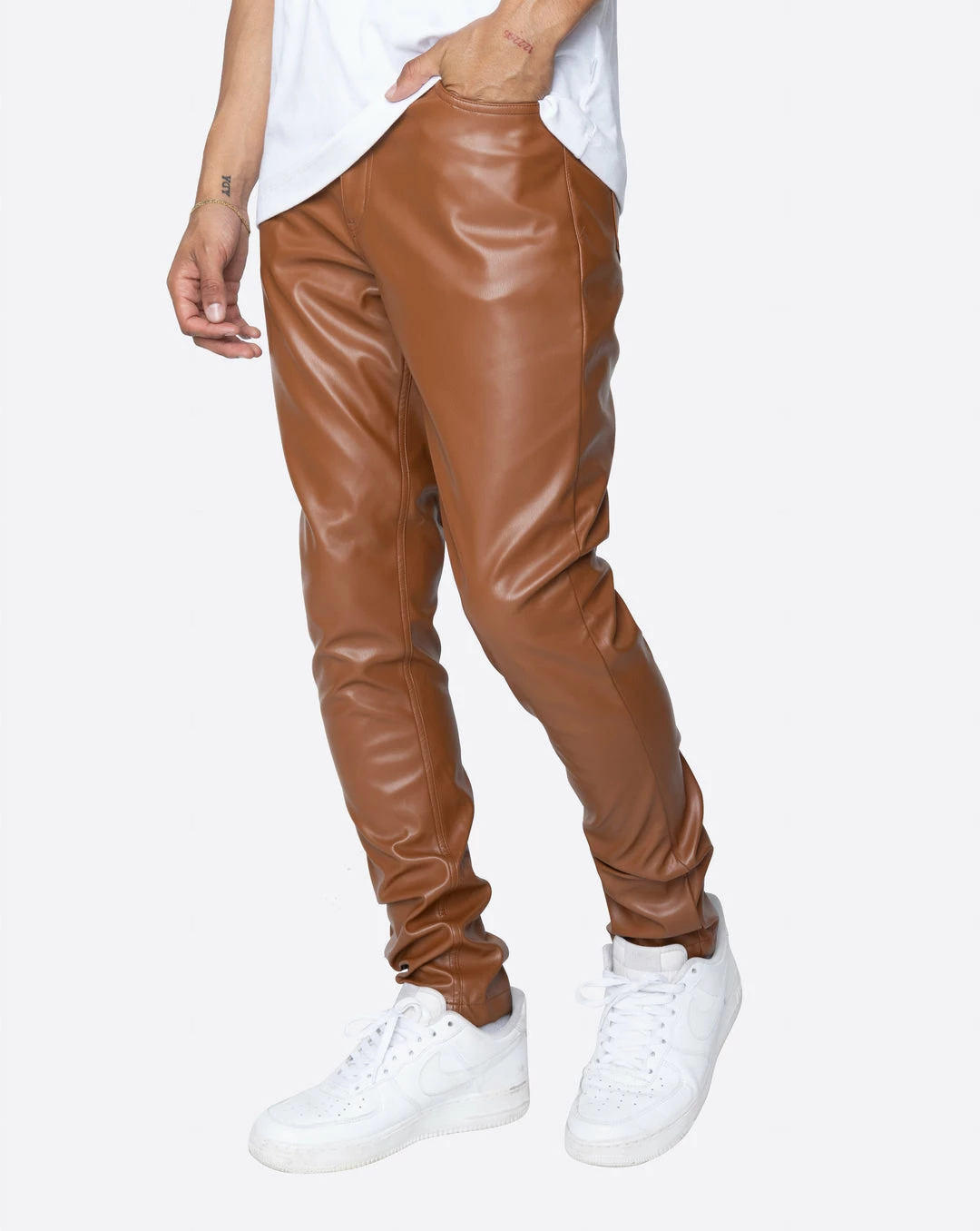 The Faux Leather Essential. A Slim fit pant with a nice stack. Perfect for a night or a casual flex. Classic & Clean – Essential for every closet.