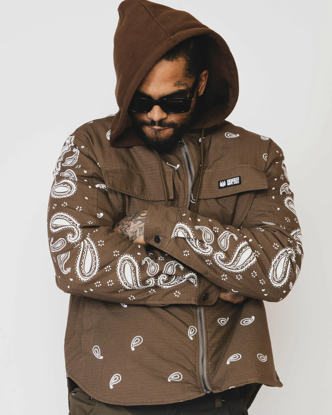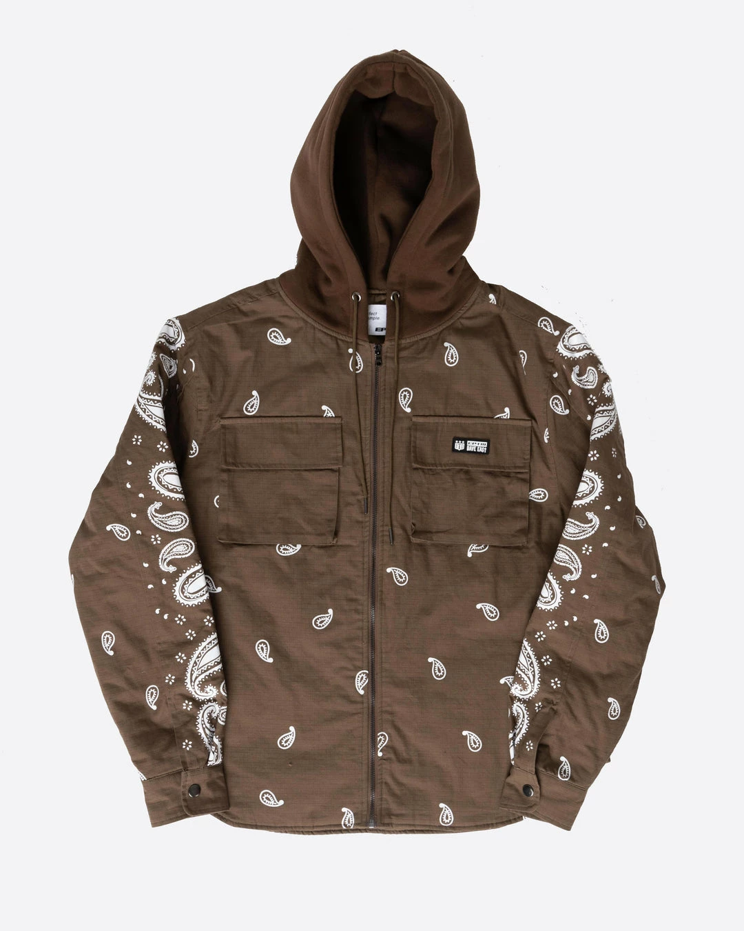 The FTD Bandana Jacket. Original paisley printed on heavyweight ripstop, featuring a fleece hood, button flap chest pockets, and welt hand pockets. Lightly filled diamond quilting as the lining for a cozy fit.