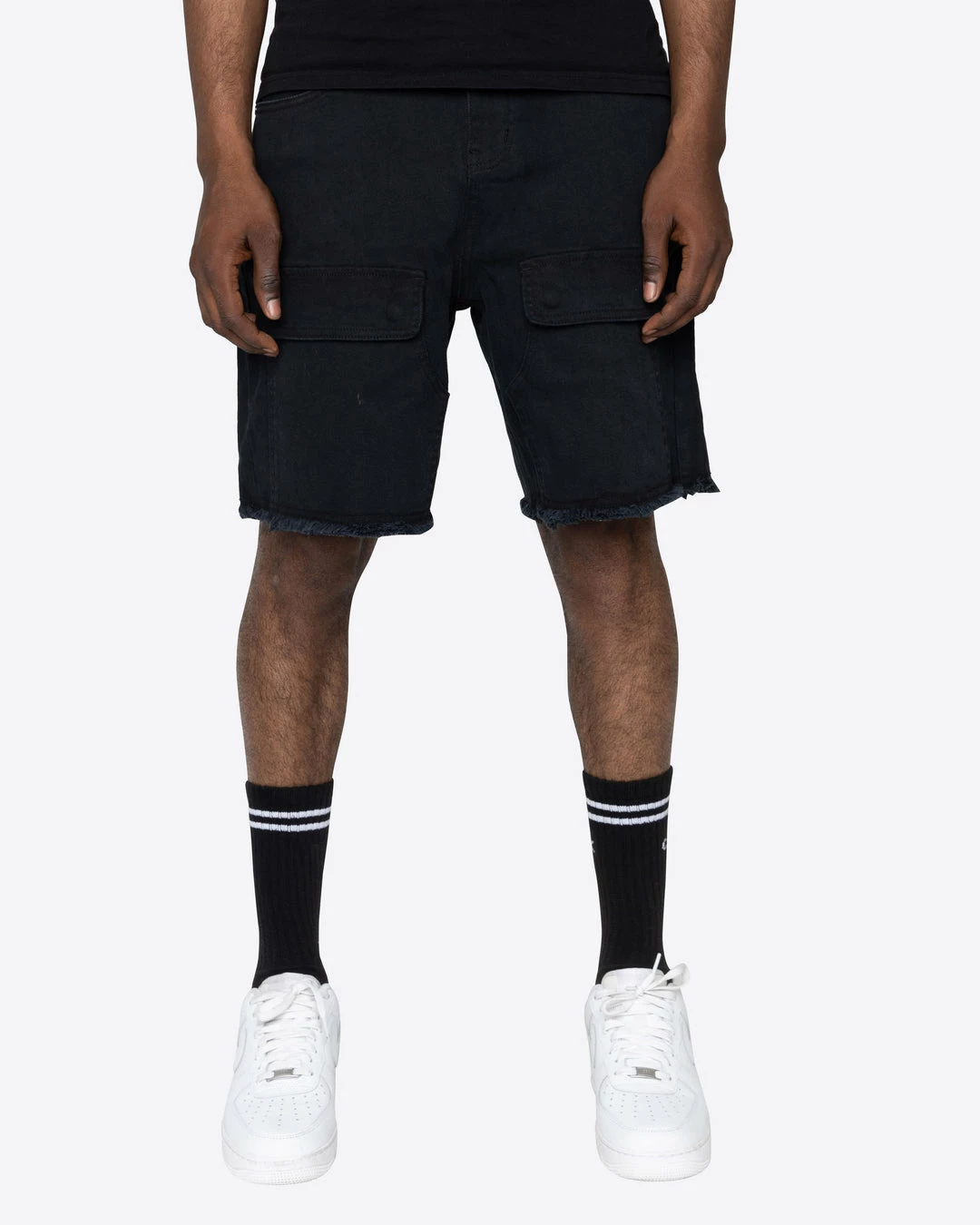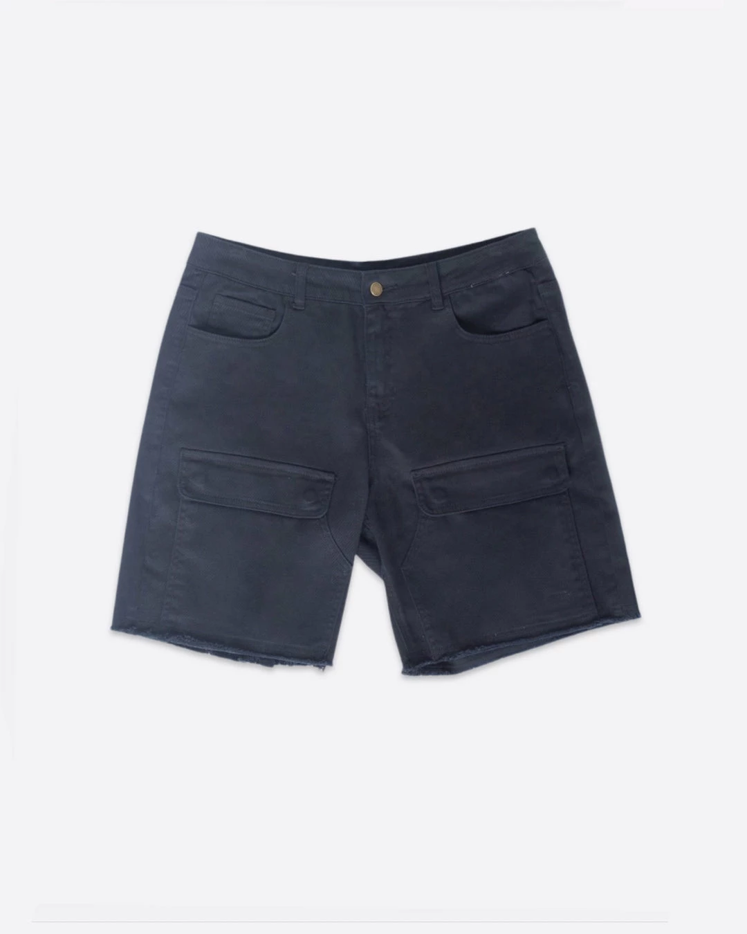 Relaxed-fit shorts featuring a stone wash and front flap pockets. Finished off with a raw cut hem.